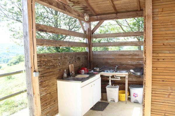 Le local sanitaire tout en bois est composé de deux douches spacieuses, deux WC à bio compostage (dits WC secs), deux éviers et deux lavabos. L'électricité de l'éclairage et des prises 12 volts y sont photovoltaïques.